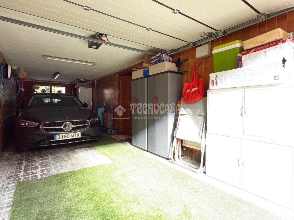 La planta sótano cuenta con cuarto de lavado y plancha, un garaje con capacidad para dos vehículos, equipado con puntos de carga para coches eléctricos, y un amplio comedor con chimenea con salida directa a una terraza y patio exterior.